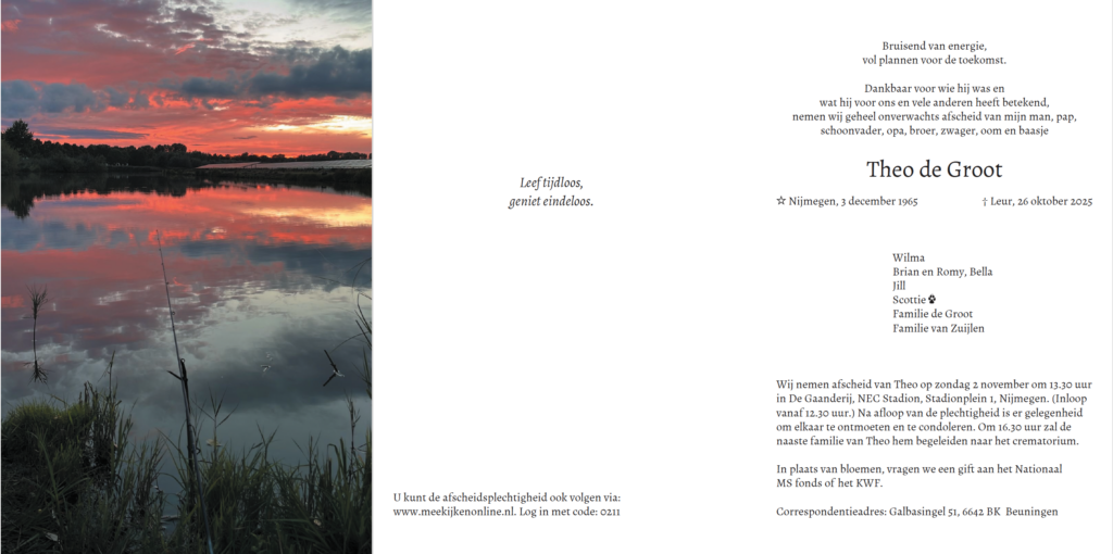 Met groot verdriet nemen wij morgen afscheid van Theo. Wij willen u laten weten dat Fyzik Fysiotherapie u de helpende hand blijft bieden.